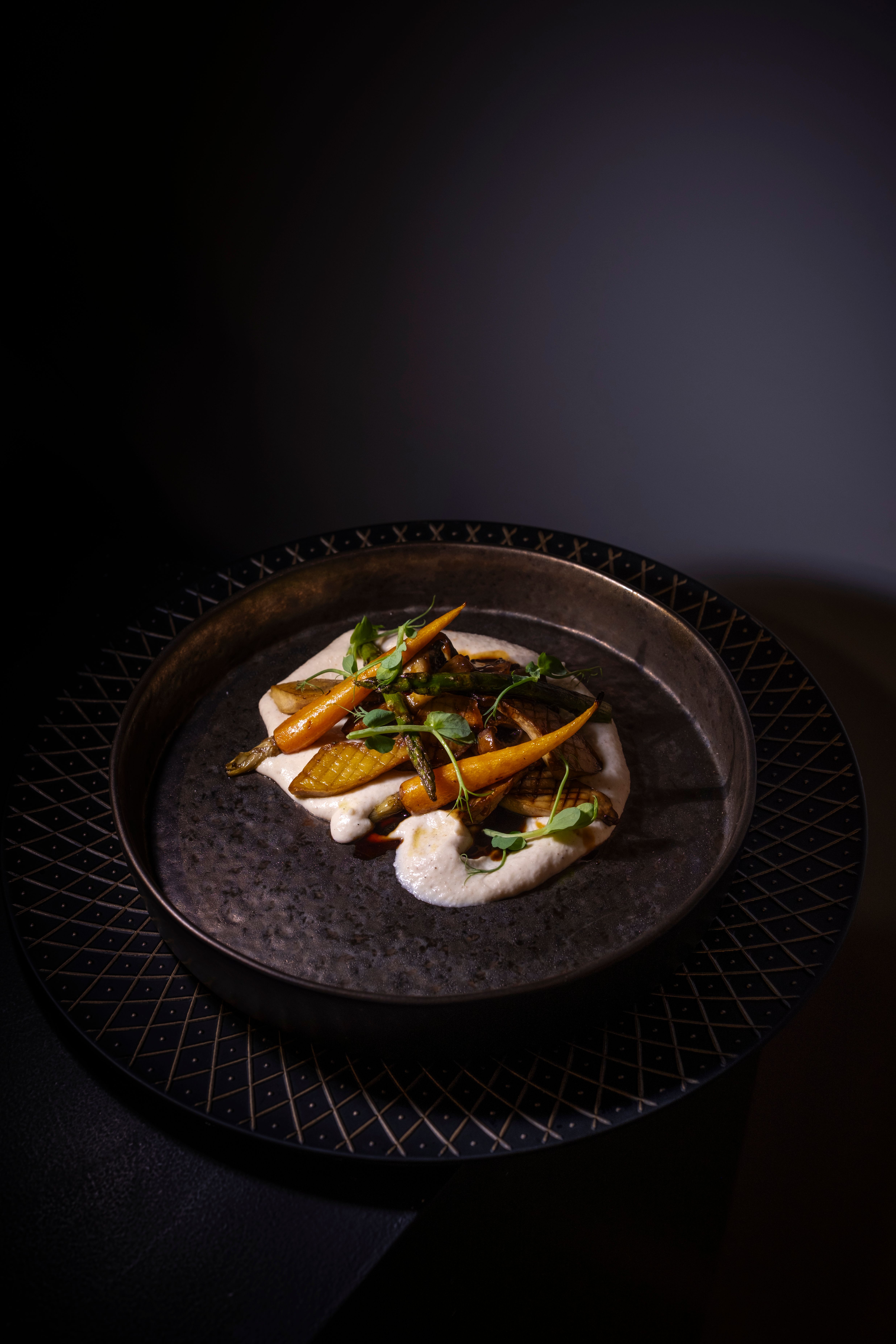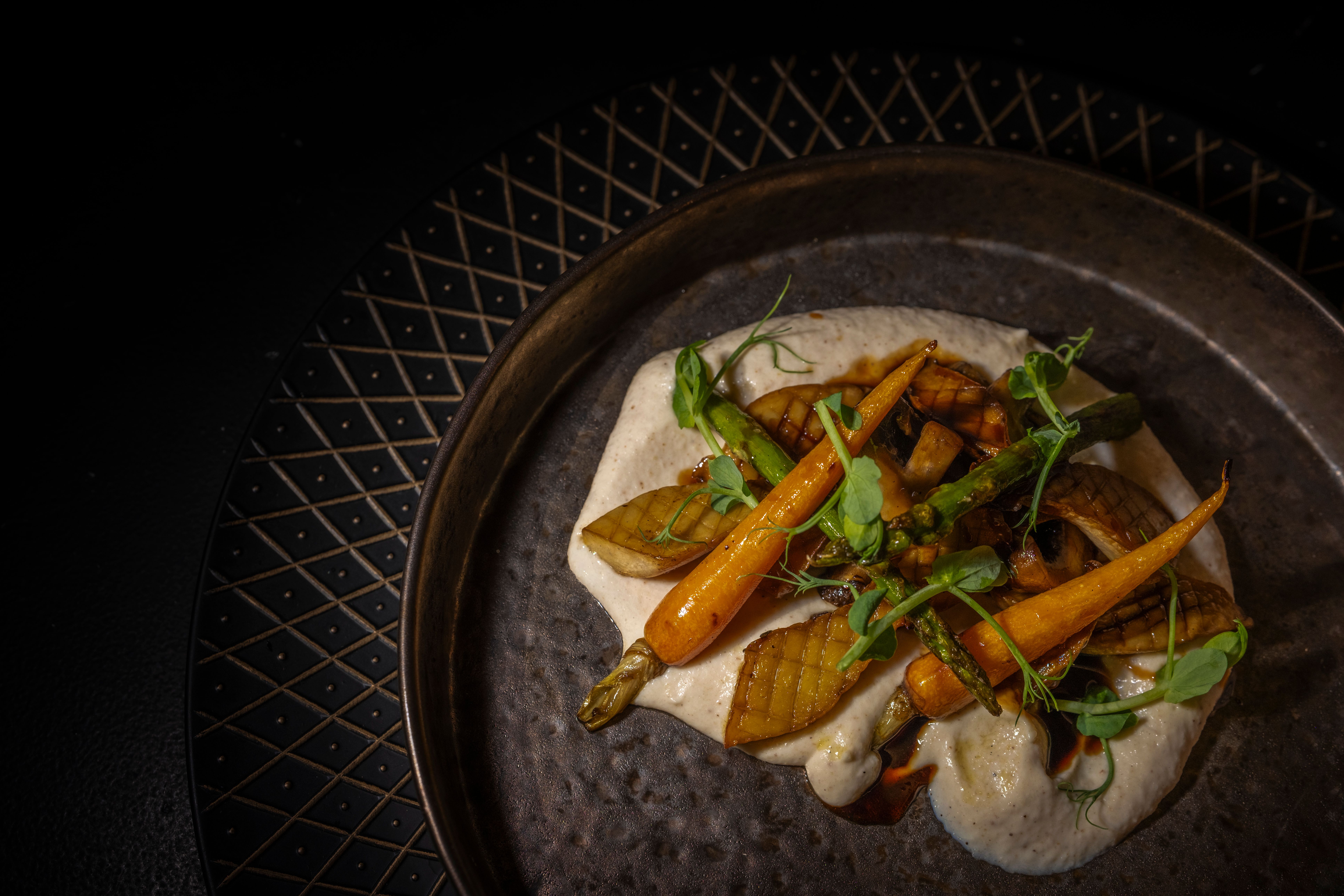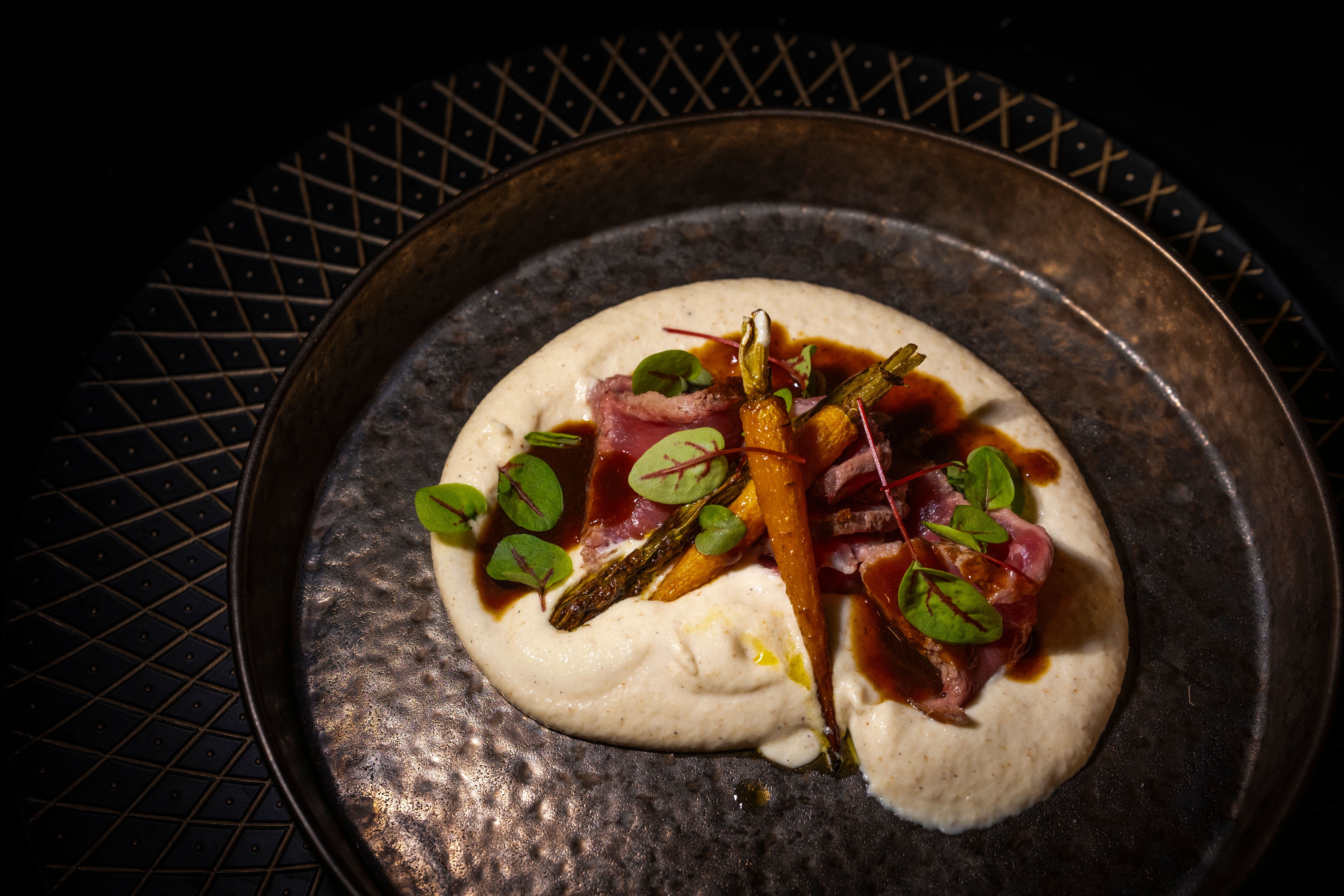 Tender roast beef with silky cauliflower mousseline, seasonal baby vegetables, and a subtle oriental sauce. Vegan option: Boletus mushroom with cauliflower mousseline and baby vegetables.