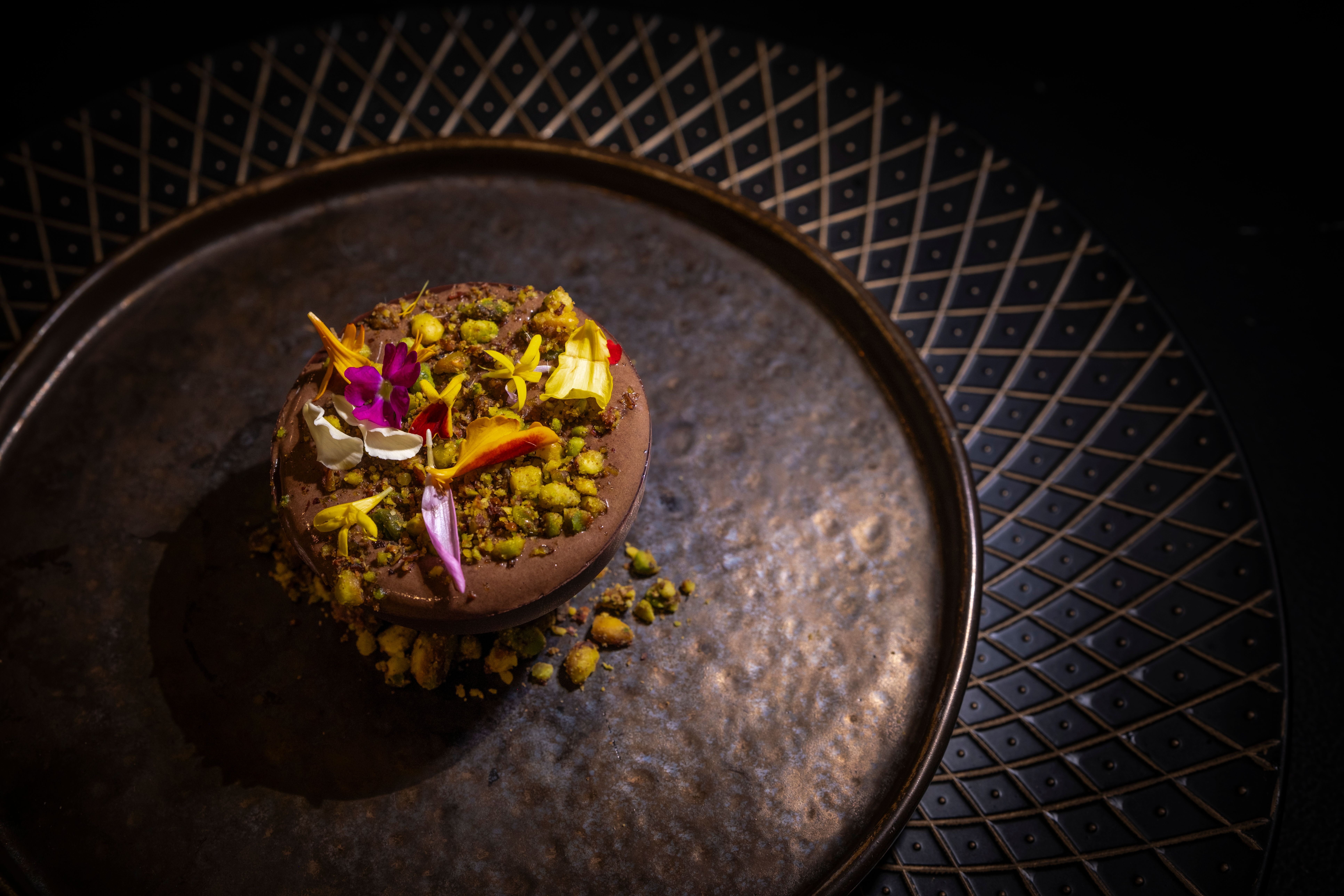 A chocolate mousse dome finished with pistachio sand — indulgent yet light.